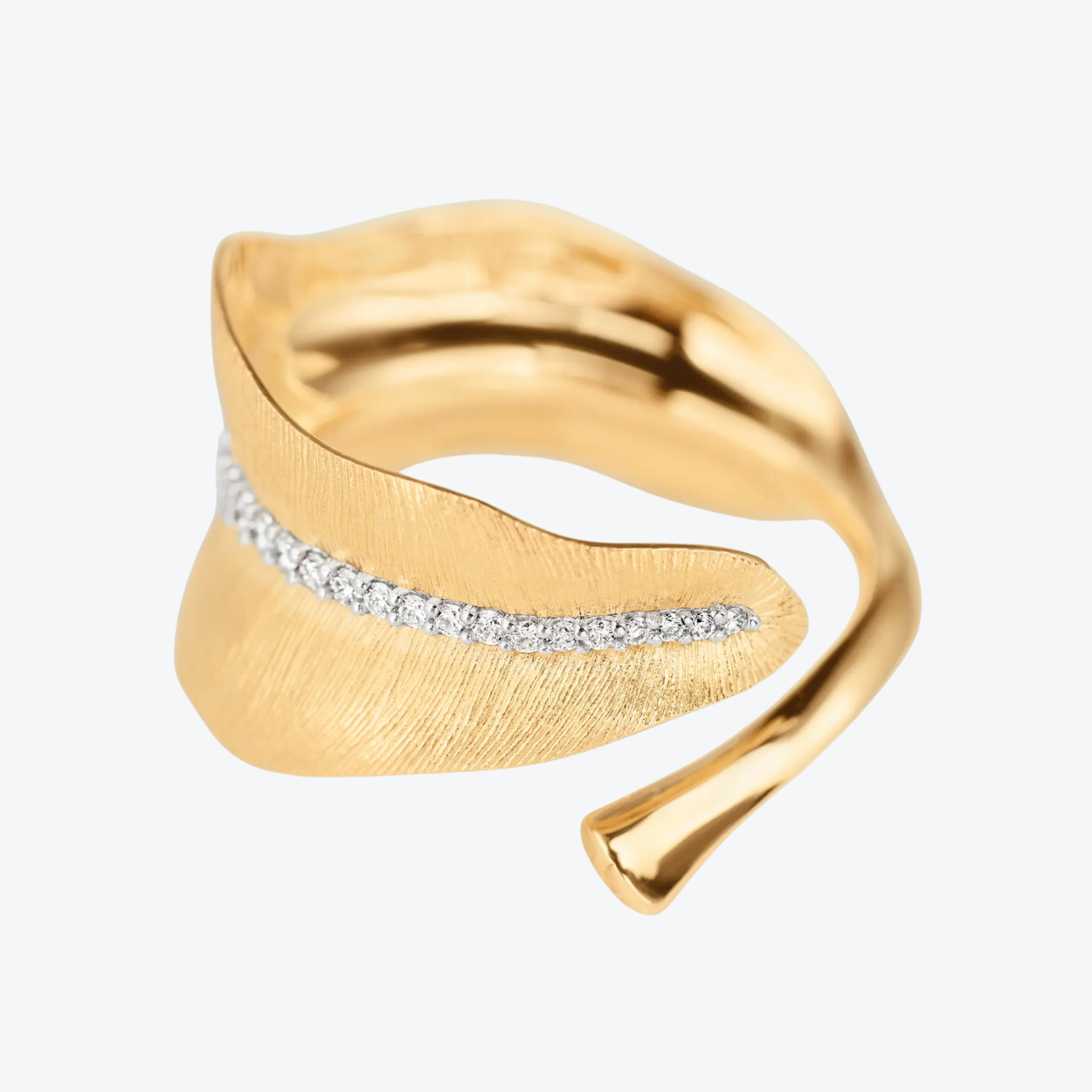 De Ole Lynggaard Leaves ring pavé medium A3009-402 is een schitterende ode aan bladmotieven met een tijdloze allure. Deze ring is vervaardigd uit 18 karaat geelgoud en subtiel bezet met 37 briljant geslepen diamanten met een totaalgewicht van 0.28 ct (TW/VS). De goudsmeden hebben met handgereedschap de vormen zorgvuldig gesculpt, waarbij matte en gepolijste accenten spelen met licht en schaduw. Dankzij de verfijnde bladstructuur is dit een ring die elegantie en natuurlijke schoonheid moeiteloos combineert. Perfect voor wie detail en finesse waardeert.