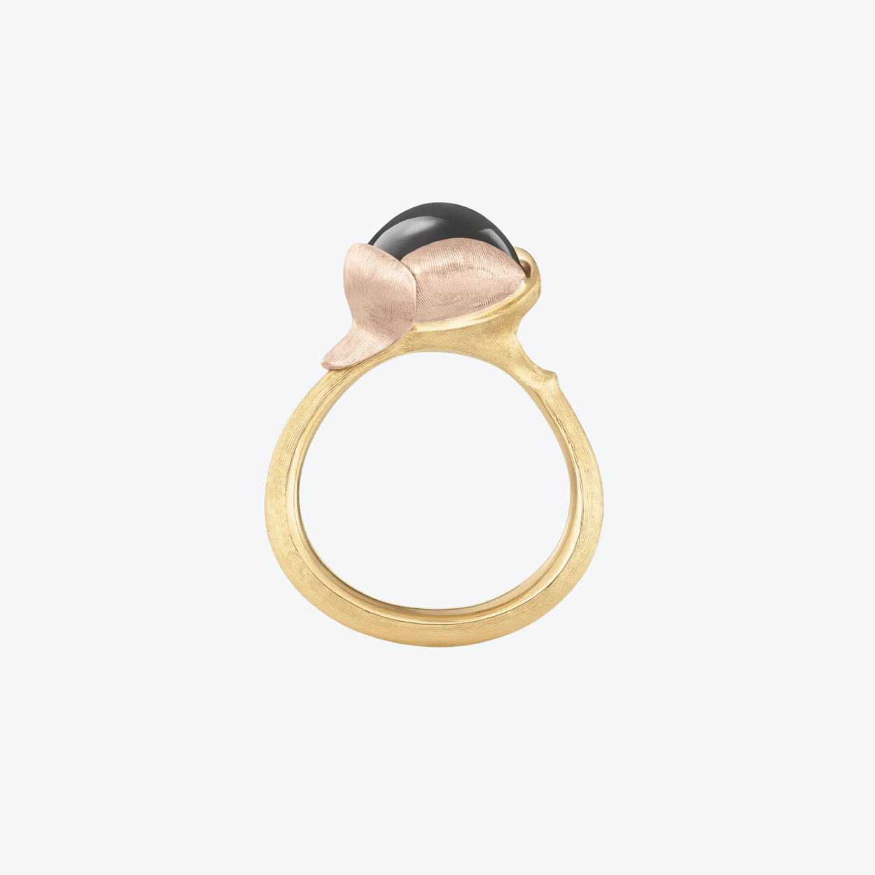 De Ole Lynggaard Lotus ring A2651-405 is een verfijnde expressie van bloemmotieven in sieraden. Deze ring is vervaardigd uit 18 karaat geelgoud gecombineerd met roségoud, en siert zich met een cabochon geslepen grijze maansteen als subtiele blikvanger. De zichtbare goudvlakken zijn zorgvuldig gesatineerd voor een zachte uitstraling, terwijl de binnenkant hoogglanzend is gepolijst. Met haar elegante vorm en natuurlijke esthetiek is dit model perfect bruikbaar als tijdloos statement en harmonisch te combineren met andere Lotus-ringen.