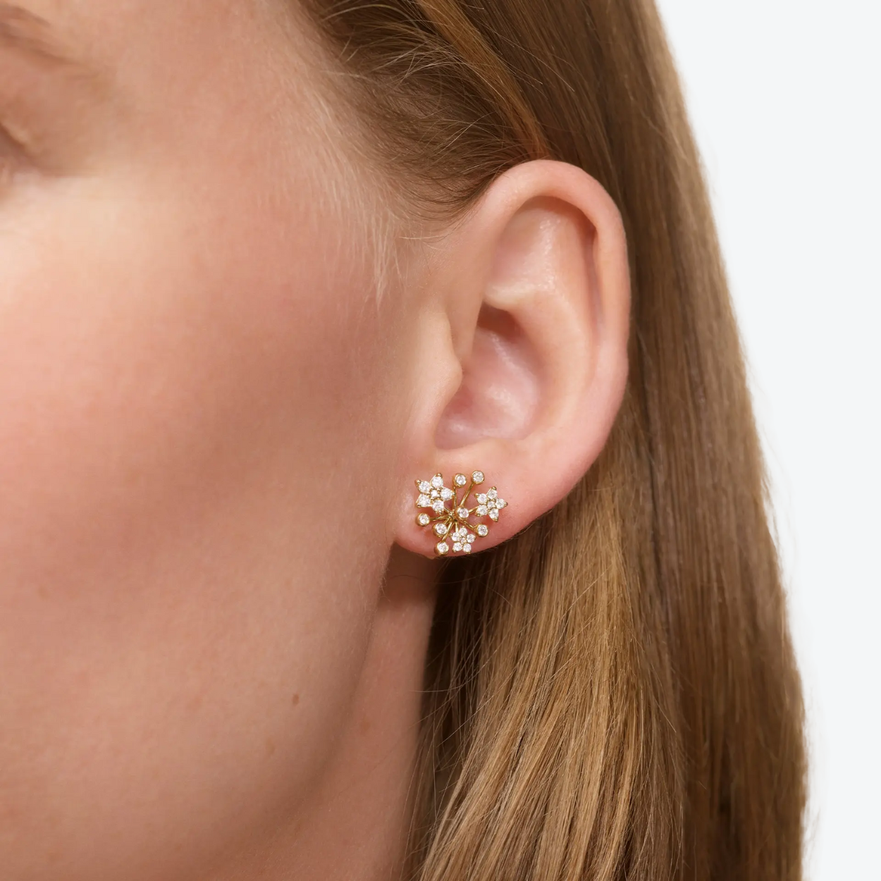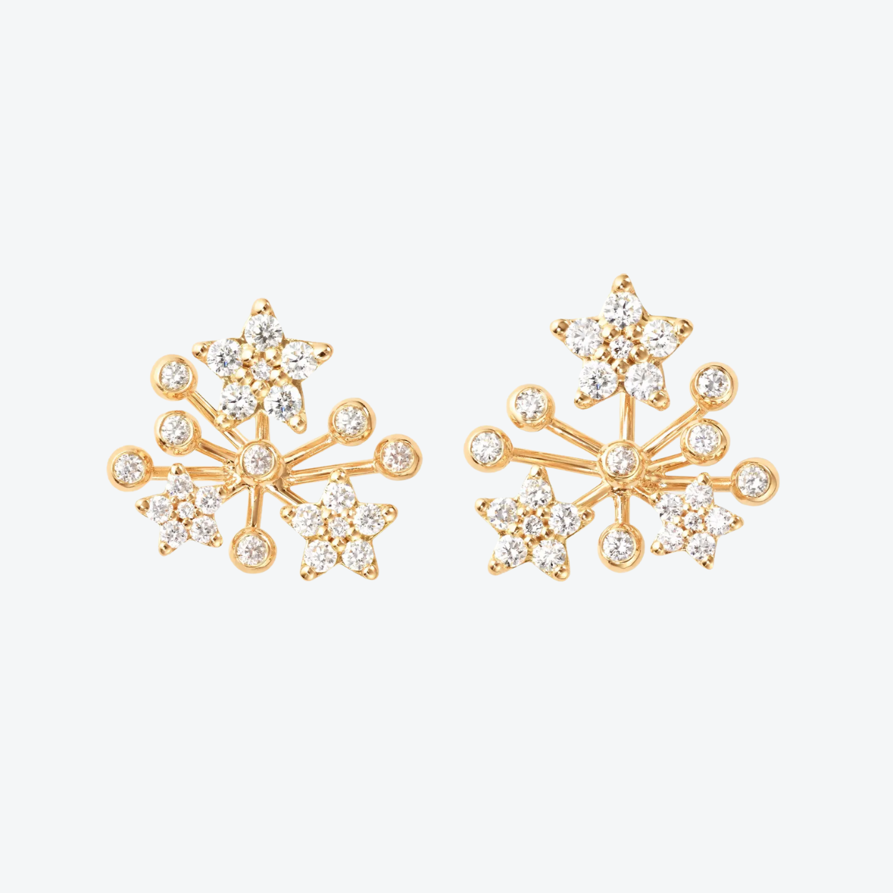 De Ole Lynggaard Shooting Stars oorknoppen A3209-401 vormen een schitterende interpretatie van het sterrenmotief in compacte vorm. Gecreëerd in 18 karaat geelgoud en bezet met 50 briljant geslepen diamanten (totaalgewicht 0.46 ct, TW/VS), bezitten deze studs drie sterrenmotieven omgeven door sprankelende stardust-accenten. Elke ster is subtiel verhoogd zodat licht door de facetten kan vallen, wat een diep en elegant glansspel creëert. Deze oorknoppen zijn ontworpen als een paar, met balans en finesse. Ideaal voor wie een discrete, maar verfijnde uitstraling zoekt.