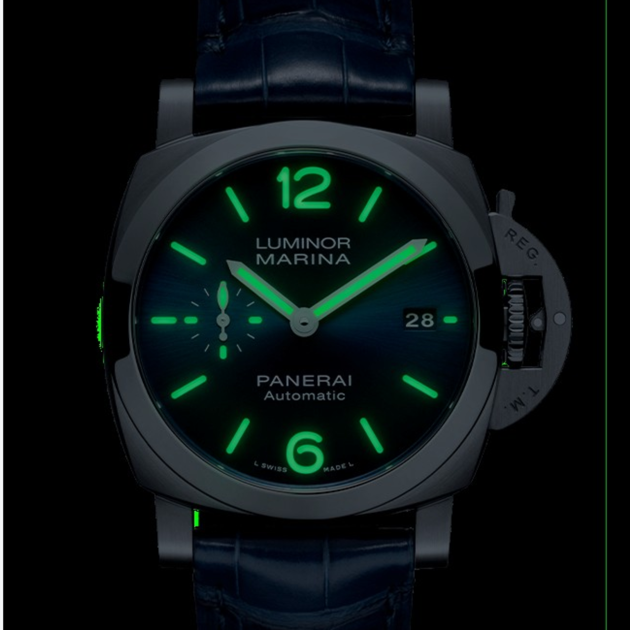 De Panerai Luminor Quaranta 40 mm – PAM01370 biedt een elegante, compacte interpretatie van klassiek Luminor-design. De 40 mm kast uitgevoerd in geborsteld AISI 316L staal is voorzien van de iconische kroonbeschermer en een gepolijste lunette. De zongeborstelde blauwe wijzerplaat met luminieuze Arabische cijfers, kleine seconde om 9 uur en datumaanduiding om 3 uur straalt rust en leesbaarheid uit. Aangedreven door het automatische P.900 kaliber met 23 robijnen, 28 800 A/h, Incabloc® schokbescherming en een gangreserve van drie dagen. Het horloge is waterdicht tot 10 bar (100 m) en wordt compleet geleverd met een donkerblauwe alligator lederen horlogeband met Click Release-systeem en trapezium gesp – een verfijnde keuze voor dagelijks draagcomfort en zakelijke elegantie.