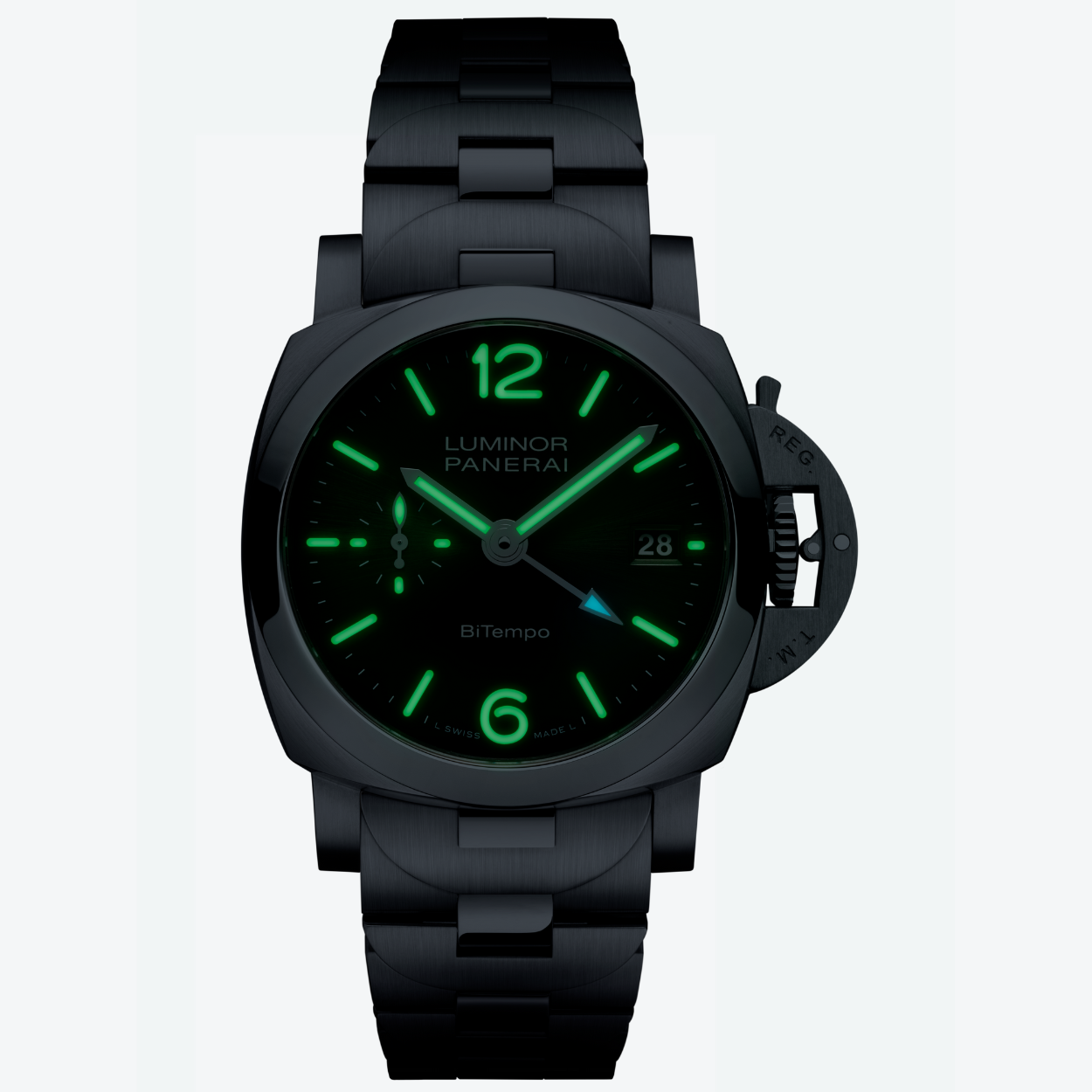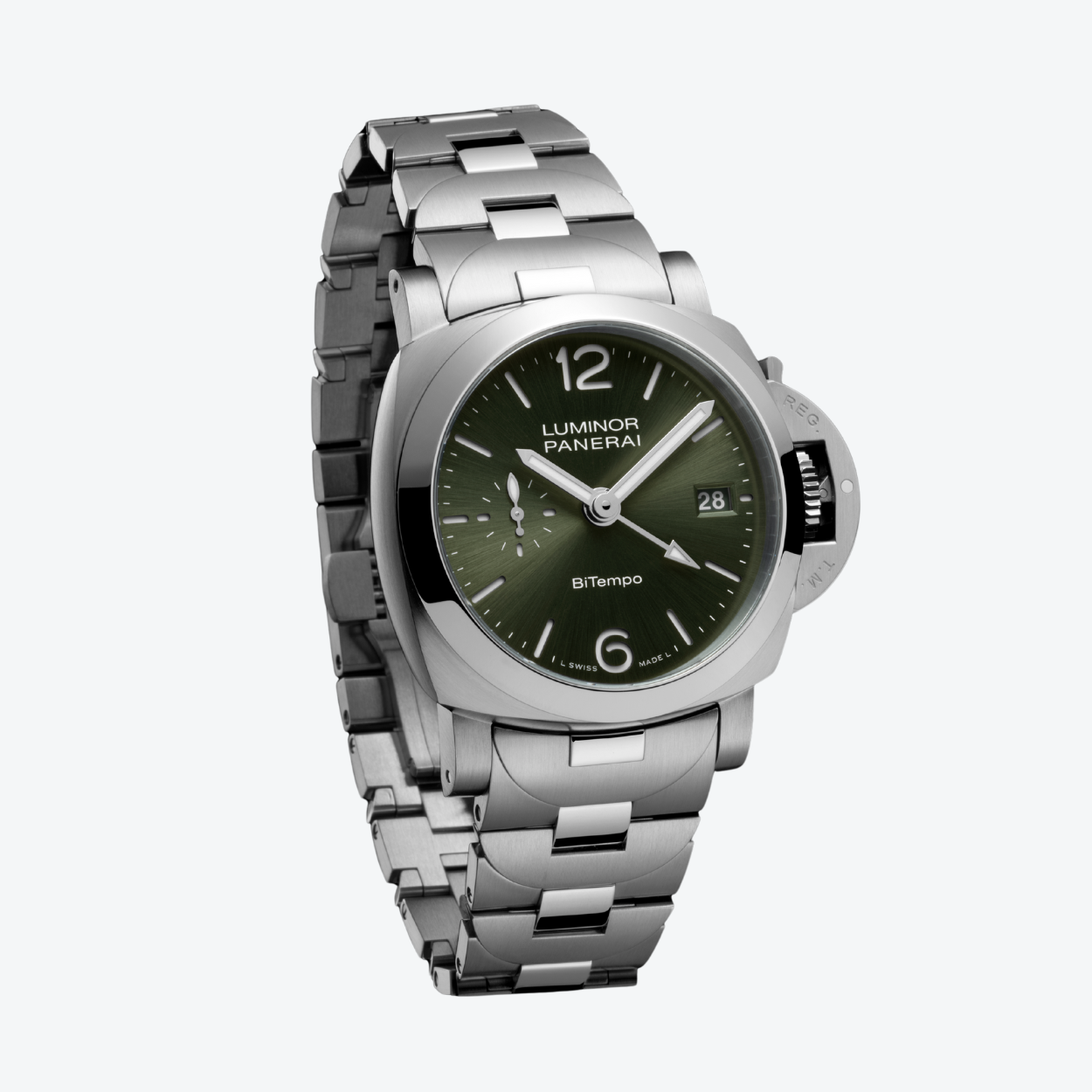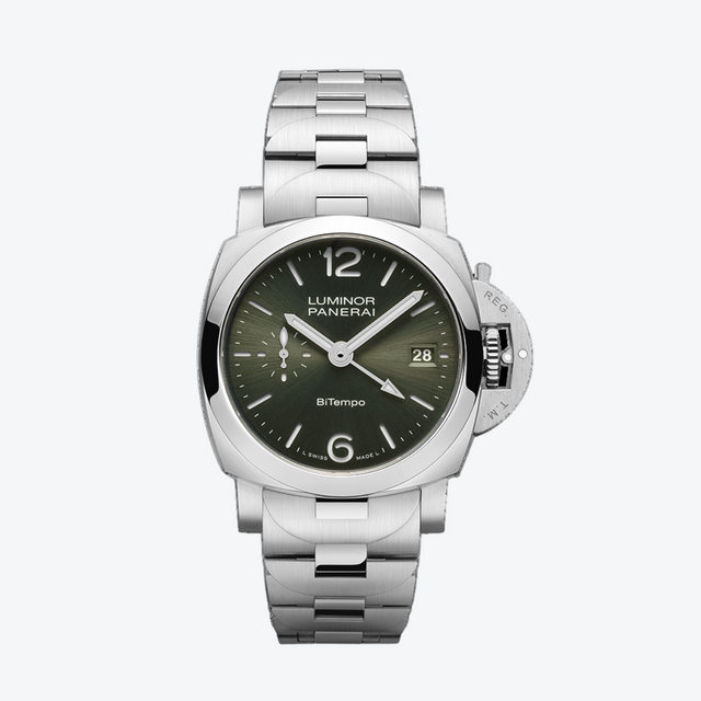 De Panerai Luminor Quaranta BiTempo 40 mm – PAM01640 combineert verfijning met functionaliteit door zijn GMT-functie, ideaal voor wereldreizigers. De 40 mm kast in geborsteld AISI 316L staal is elegant en herkenbaar dankzij de gepolijste lunette en kroonbrug. De groene sun‑brushed wijzerplaat met luminieuze Arabische cijfers, datum op 3 uur en kleine seconde op 9 uur straalt zowel stijl als duidelijkheid uit. Binnenin werkt het automatische P.900/GMT kaliber met GMT-tijdzoneweergave, Incabloc® schokbescherming en een gangreserve van 72 uur. Door saffierglas en waterdichtheid tot 10 bar (100 m) is dit horloge geschikt voor alledaags gebruik. Geleverd met een geborstelde stalen schakelband en vlindersluiting, vormt de PAM01640 zowel een luxe als praktische keuze.