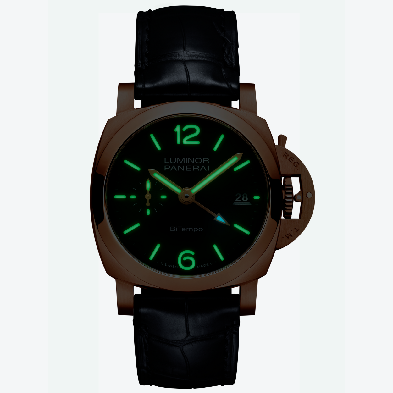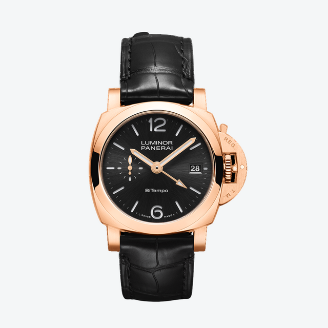 De Panerai Luminor Quaranta BiTempo Goldtech™ 40 mm – PAM01641 vormt een harmonieuze samensmelting van verfijnde luxe en functionele veelzijdigheid. De kast in geborsteld Goldtech™, een robuuste roodgoudlegering, meet elegant 40 mm en is voorzien van de iconische kroonbescherming en gepolijste lunette. De zwarte wijzerplaat met luminieuze Arabische cijfers, kleine seconde op 9 uur, datum op 3 uur en BiTempo GMT-tijdzoneweergave, combineert stijl met gebruiksgemak. Onder de transparante saffier achterzijde tikt het automatische P.900/GMT kaliber met Incabloc® anti-shock, 23 robijnen en een gangreserve van drie dagen. Gecompleteerd met een zwarte alligatorlederen band en trapezium gesp in Goldtech™, belichaamt dit horloge zowel elegantie als technische superioriteit, perfect voor dagelijks gebruik met een luxueuze allure.