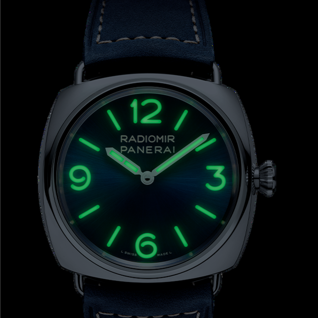 De Panerai Radiomir Officine 45 mm – PAM01383 is een harmonieuze mix van vintage stijl en vakmanschap. De gepolijste roestvrijstalen kast van 45 mm herbergt het met de hand opgewonden P.6000 kaliber, dat een gangreserve van drie dagen biedt en voorzien is van Incabloc® schokbescherming voor betrouwbaarheid. De zongeborstelde blauwe wijzerplaat met luminieuze Arabische cijfers straalt rust uit, met klassieke Radiomir-lugs en een trapezium gesp op de bijpassende blauwe kalfslederen band. Met een waterdichtheid van 10 bar (100 m) is dit horloge zowel alledaags draagbaar als geschikt voor matig natte omstandigheden. Een tijdloos model dat heritage en hedendaagse elegantie moeiteloos verbindt.