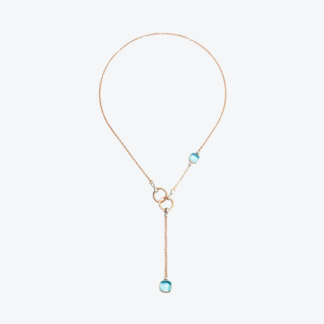 Het Pomellato Nudo collier PCB9051_O6000_DB0OY is uitgevoerd in 18 karaat roségoud en witgoud en toont de iconische cushion-geslepen London Blue topaz in de kenmerkende “naakte” zetting. De steen, van circa 7 ct, schittert met diepe blauwe tonen en is bevestigd aan een verfijnde roségouden ketting met karabijnsluiting. Het collier kan op meerdere lengtes worden gedragen voor een elegante pasvorm rond de hals. Een tijdloos juweel dat kleur en klasse op subtiele wijze combineert.