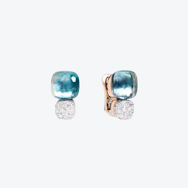 De Pomellato Nudo oorbellen POB7041_O6000_DB0OY combineren 18 karaat rosé- en witgoud in een verfijnde mix, omlijst door glanzende topaas edelstenen en sprinkels van witte diamanten. De edelstenen zijn facetgeslepen en gezet in een klassieke Nudo-stijl met een bezel- of randzetting, die de stenen veilig omhult en het licht schitterend laat reflecteren. Het ontwerp is elegant maar opvallend, geschikt voor zowel dagelijkse verfijning als speciale gelegenheden, en de afwerking is hoogglans gepolijst. De oorbellen zijn een uitdrukking van stijlbewustzijn en tijdloze luxe.
