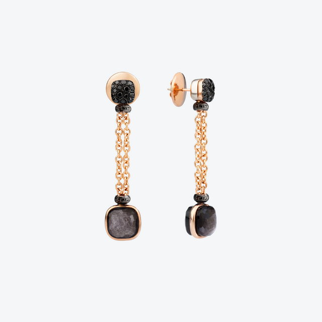 De Pomellato Nudo oorbellen POB9050_O6000_DBKOS zijn vervaardigd in 18 karaat roségoud en witgoud, met edelsteencombinatie van gepolijst obsidiaan en inleg van zwart behandelde diamanten. De obsidiaanstenen vormen het centrale element in de Nudo-stijl, omlijst door de fonkelende diamanten in pavé-zetting, waarbij de donkere tonen van zwart mooi contrasteren met het rosé- & witgoud. De afwerking is hoogglans gepolijst, en de sluiting (post/sluiting voor doorboorde oren) zorgt voor draagcomfort. Deze oorbellen zijn een opvallend stuk dat zowel ’s avonds als overdag gedragen kan worden — mysterieus, stijlvol en krachtig.