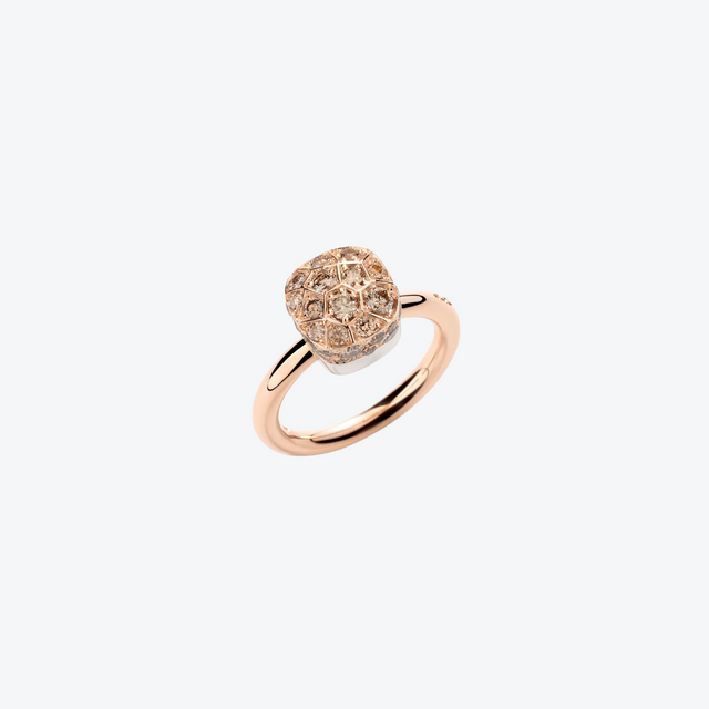 De Pomellato Nudo Solitaire Petit ring (PAC2501_O6000_DBR00) is uitgevoerd in 18 karaat roségoud en witgoud, bezet met 39 bruine diamanten met een totaalgewicht van circa 0,9 ct. De warme gloed van de diamanten wordt versterkt door de roségouden zetting, terwijl het witgoud voor een subtiel contrast zorgt. Het iconische, verfijnde Nudo-design maakt deze ring tot een tijdloze keuze, perfect om solo te dragen of te combineren met andere Nudo-creaties.