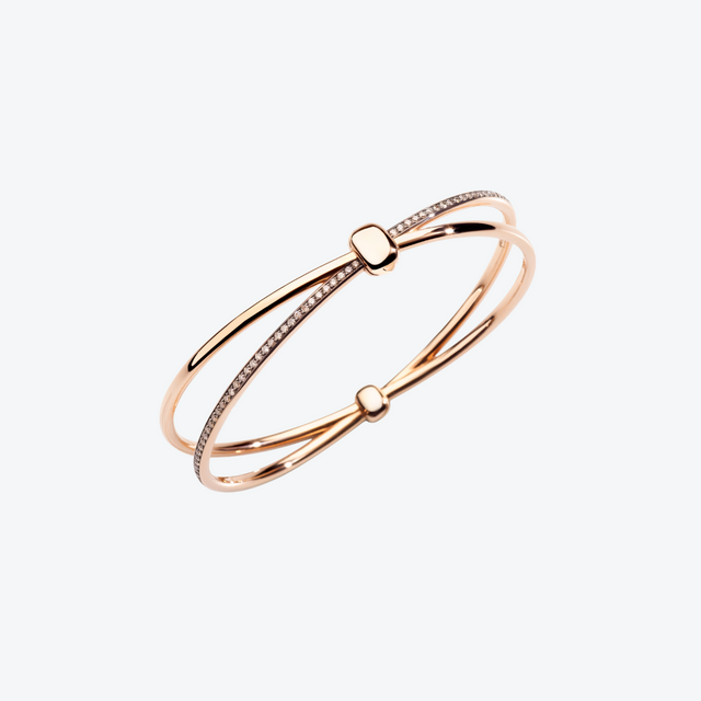 De Pomellato Together armband PBC3070_O7BKR_DBR00 is vervaardigd uit 18 karaat roségoud, gecombineerd met delen zwart-gerhodineerd roségoud, en bezet met 115 bruine diamanten met een totaalgewicht van ca. 0,90 caraat. De armband is vormgegeven als een cuff-bangle met de kenmerkende dubbele band (“double bands”) die met elkaar verbonden zijn door een centrale link, waarbij één band geheel roségoud is en de andere band rijkelijk gezet is met diamanten. De afwerking is hoogglans gepolijst goud, met aandacht voor contrast en sculpturale lijnen. Verkrijgbaar in meerdere maten (o.a. S, M, L), passend bij verschillende polsomtrekken. De Together armband is een sterk symbolisch stuk, perfect te dragen zowel overdag als bij speciale gelegenheden — stijlvol, krachtig én persoonlijk.