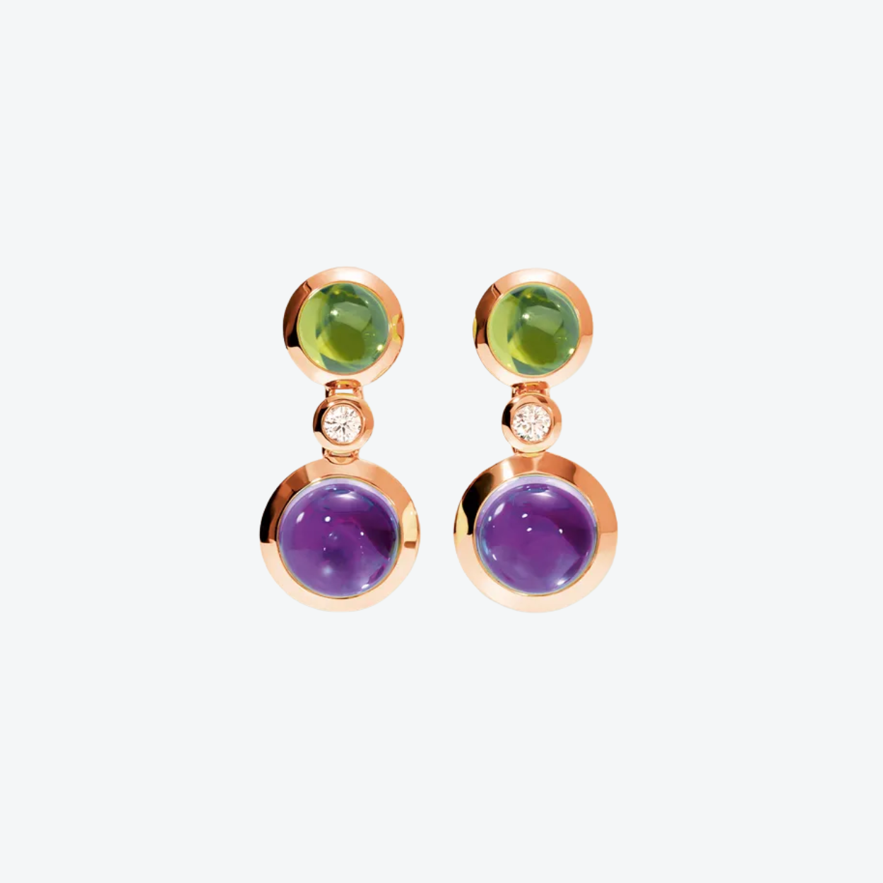 De Bouton Aurora' oorbellen van Tamara Comolli stralen elegante verfijning uit met een kleurrijke twist. In 18 karaat roségoud schitteren twee cabochon geslepen edelstenen: een paar amethisten (Ø 11 mm, totaal 9,0 ct) en een paar peridoten (Ø 8 mm, totaal 4,4ct). De compositie wordt subtiel geaccentueerd door twee briljant geslepen diamanten (0,28ct, G/SI1), die een extra vleugje sprankeling toevoegen. Met een lengte van 3 cm combineren deze oorbellen tijdloze elegantie met speelse expressie. Een juweel dat kleur, luxe en draagcomfort moeiteloos verenigt.
