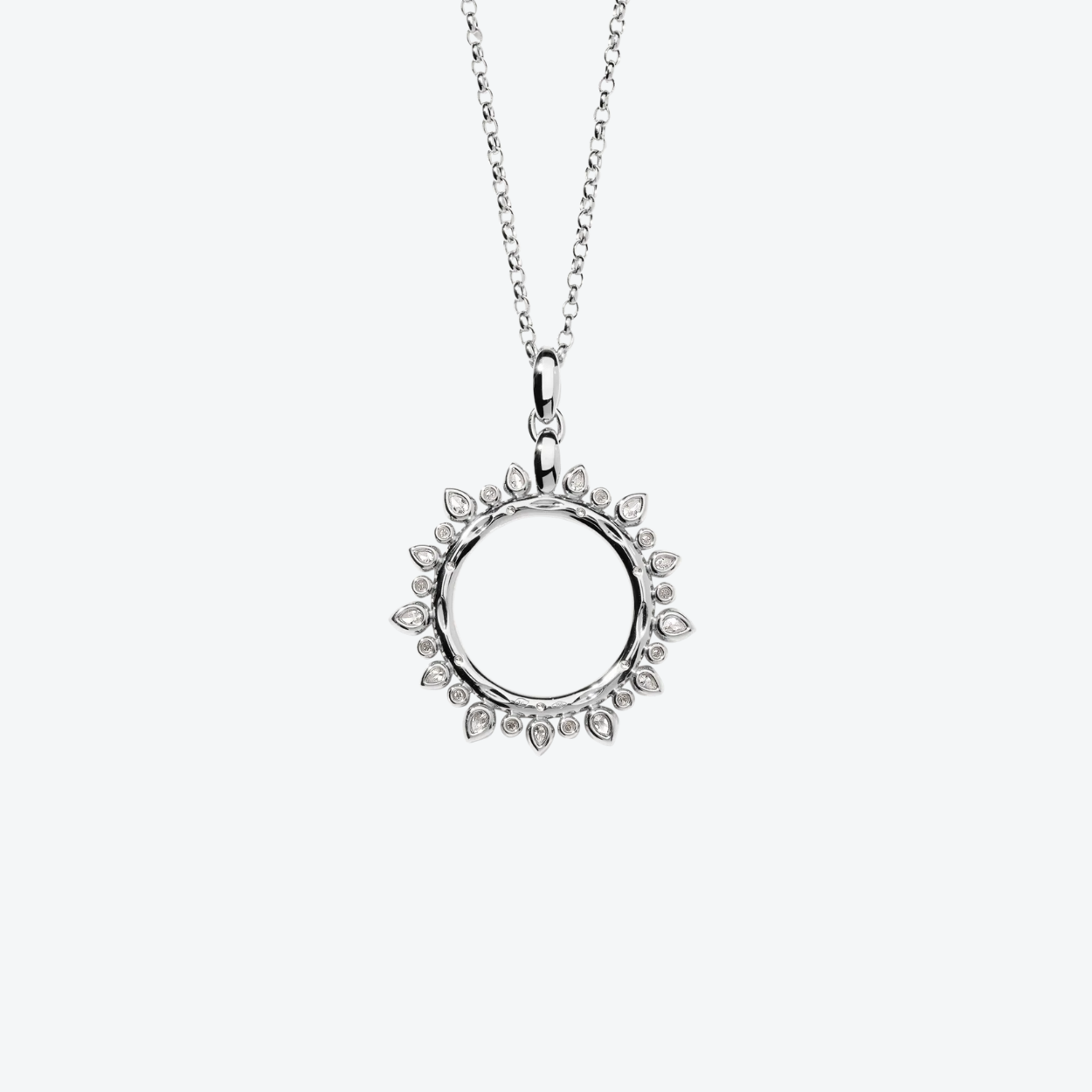 De Gypsy “Classic Sun Large” hanger (ref. P-Gyp-Cl-l-wg) vult elke look met een luxueus zonnig accent. Uitgevoerd in 18 karaat witgoud, schittert hij met 1,13ct peer geslepen diamanten die gestimuleerd worden door 0,43ct briljant-geslepen diamant-pavé (G/SI). Met een diameter van 36 mm heeft deze hanger een krachtige maar verfijnde uitstraling — perfect voor solo-dragers of als sprankelend middelpunt aan een collier.