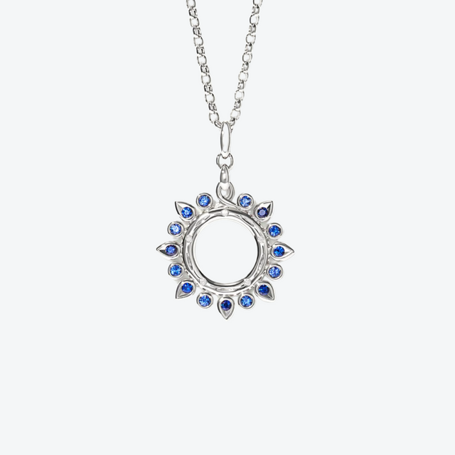 De Gypsy ‘Ocean Sun’ hanger (ref. P‑Gyp‑Oce‑S‑wg) vangt de essentie van licht en natuur in een elegant design. Uitgevoerd in 18 karaat witgoud, vormt de zonvormige structuur een cirkel met sprankelende briljant- en peer geslepen diamanten (0,57ct, G/SI) en daartussen intense blauwe saffieren (0,66ct). Met een diameter van 36 mm is het een opvallend maar verfijnd statement dat zowel casual aan een lederen koord als elegant aan een fijn collier gedragen kan worden.