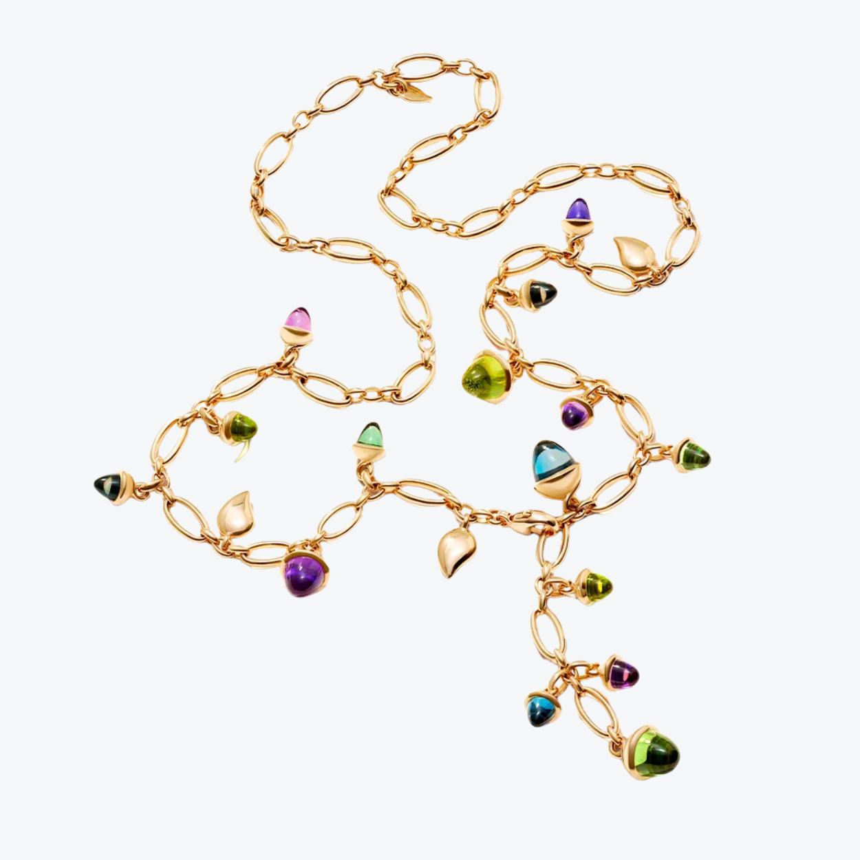 Het Mikado Collier 'Aurora' van Tamara Comolli is een speels eerbetoon aan kleur en beweging. Uitgevoerd in 18 karaat roségoud, schittert het collier met een rijke variatie aan cabochon geslepen edelstenen in de iconische acorn-vorm: een amethist van 3,0ct, een peridot van 3,8ct, een London blue topaas van 4,0ct en een groene toermalijn van 3,3ct. Daarnaast is het collier verfijnd gedecoreerd met kleinere acorns in amethist (2,61ct), peridot (2,10ct), London blue topaas (3,60ct), toermalijn (2,0ct) en ioliet (2,85ct).
