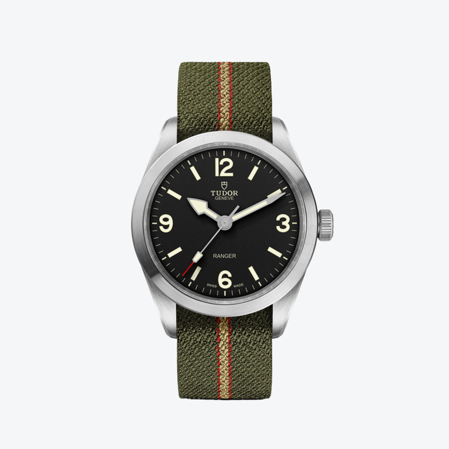 De Tudor Ranger is een eerbetoon aan de field watches uit de jaren 60. Het horloge heeft een geborstelde stalen kast en een kenmerkende zwarte wijzerplaat met Arabische cijfers en rood accent op de secondewijzer. Binnenin tikt het manufacture MT5402 uurwerk met COSC-certificering en 70 uur gangreserve. De zwarte stoffen band met rode streep zorgt voor een sportieve afwerking.