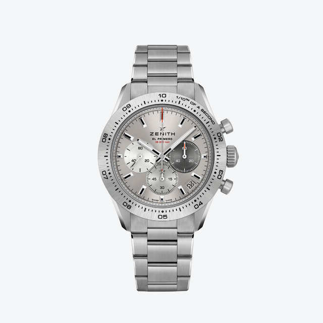 De Zenith Chronomaster Sport 95.3100.3600/39.M3100 belichaamt sportieve elegantie en technische verfijning met een opvallende grijze wijzerplaat en volledig titanium kast. De 41 millimeter kast is lichtgewicht en duurzaam, met een bijpassende titanium armband die een ongeëvenaard draagcomfort biedt. De wijzerplaat toont een verfijnde balans tussen kleur, functie en traditie, met de iconische El Primero-subdials in ton-sur-ton grijstinten. Binnenin tikt het automatische El Primero 3600 kaliber met een hoge frequentie van 5 Hz, waardoor een uiterst nauwkeurige meting tot 1/10e seconde mogelijk is. De chronograaf is uitgerust met een sportieve bezel in gesatineerd titanium, voorzien van een gegraveerde 1/10e seconde schaalverdeling. De gangreserve bedraagt circa 60 uur. Deze Chronomaster Sport is een indrukwekkende combinatie van prestaties, gewichtloos comfort en eigentijdse stijl – ideaal voor wie op zoek is naar een robuuste en exclusieve sportchronograaf.