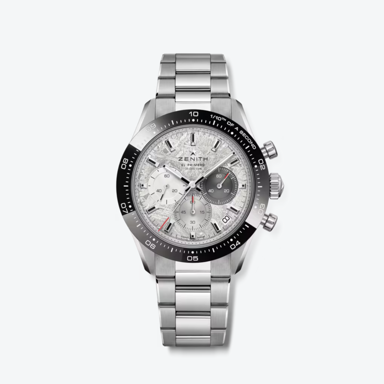 De Zenith Chronomaster Sport 03.3120.3600/76.M3100 is een moderne sportchronograaf waarin techniek en design samenkomen. De 41 millimeter stalen kast wordt gecombineerd met een unieke meteorietwijzerplaat, waardoor elk exemplaar een eigen karakter heeft. De keramische bezel met 1/10e seconde schaal onderstreept het prestatiegerichte ontwerp. Binnenin werkt het El Primero 3600 kaliber met hoge frequentie, goed voor een nauwkeurige 1/10e seconde meting en een gangreserve van circa 60 uur. Waterdicht tot 100 meter en voorzien van een comfortabele stalen armband, staat deze Chronomaster Sport voor precisie, duurzaamheid en een uitgesproken, eigentijdse stijl.