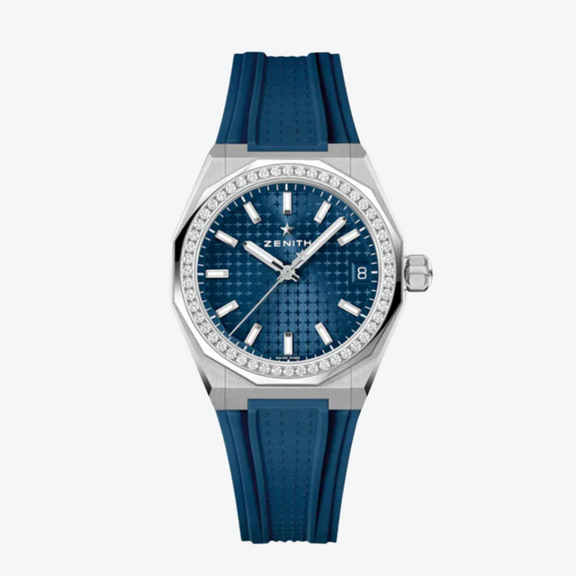 De Zenith Defy Skyline 16.9400.670/51.I001 is een verfijnde en eigentijdse interpretatie van sportieve elegantie. De kast meet 36 millimeter en is uitgevoerd in staal met gepolijste en gesatineerde oppervlakken. De hoekige lunette omlijst een diepblauwe wijzerplaat met zonnestraalafwerking, verfraaid met een ingegraveerd geometrisch patroon gebaseerd op het Zenith-vierpuntige sterlogo. Binnenin tikt het automatische Elite 670 kaliber, dat zorgt voor betrouwbare prestaties en een gangreserve van circa 50 uur. De wijzerplaat toont centrale uren, minuten, seconden en een datumaanduiding op 3 uur. Dankzij het saffierglas en de schroefkroon is het horloge waterdicht tot 100 meter. De geïntegreerde stalen horlogeband draagt soepel en wordt geleverd met een extra blauwe rubberen band, die eenvoudig verwisselbaar is via het snelle bandwisselsysteem. Een perfect geproportioneerd horloge dat design en functionaliteit naadloos samenbrengt.