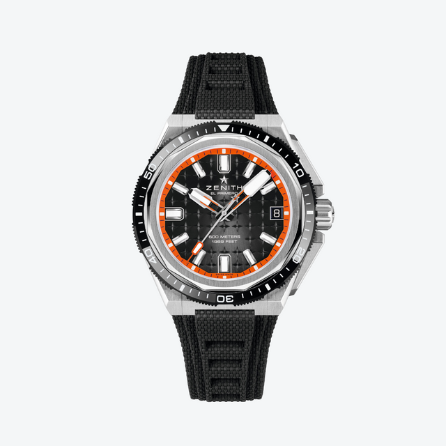 De Zenith Defy Skyline Chronograph 95.9600.3620/21.I300 combineert krachtige architectuur met de technische precisie van Zenith’s El Primero-uurwerk. De imposante 42,5 millimeter kast is vervaardigd uit gesatineerd titanium en toont strakke geometrische lijnen, een karakteristieke twaalfhoekige lunette en een geïntegreerde titanium band. De zwarte wijzerplaat is versierd met een gravurepatroon van vierpuntige sterren, geïnspireerd op het Zenith-logo, en voorzien van drie subdials voor de chronograaffunctie met een 1/10e seconde meting. Het hart van dit horloge is het automatische kaliber El Primero 3600, tikkend op 5 Hz en zichtbaar via de transparante kastbodem. Dankzij het quick-change bandensysteem wordt veelzijdigheid toegevoegd: het horloge wordt geleverd met een extra zwart rubberen horlogeband. Met een waterdichtheid tot 100 meter en een gangreserve van circa 60 uur is deze Defy Skyline Chronograph een sportief maar verfijnd statement voor wie zoekt naar vorm, functie en innovatie.